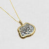 A gold-plated 935 sterling silver necklace, centered with an engraved talisman of ancient hand motifs encircled by ritual markings.