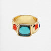 Bold stainless steel ring set with deep red and ocean-blue stones. Sculptural, striking, and designed for everyday wear.